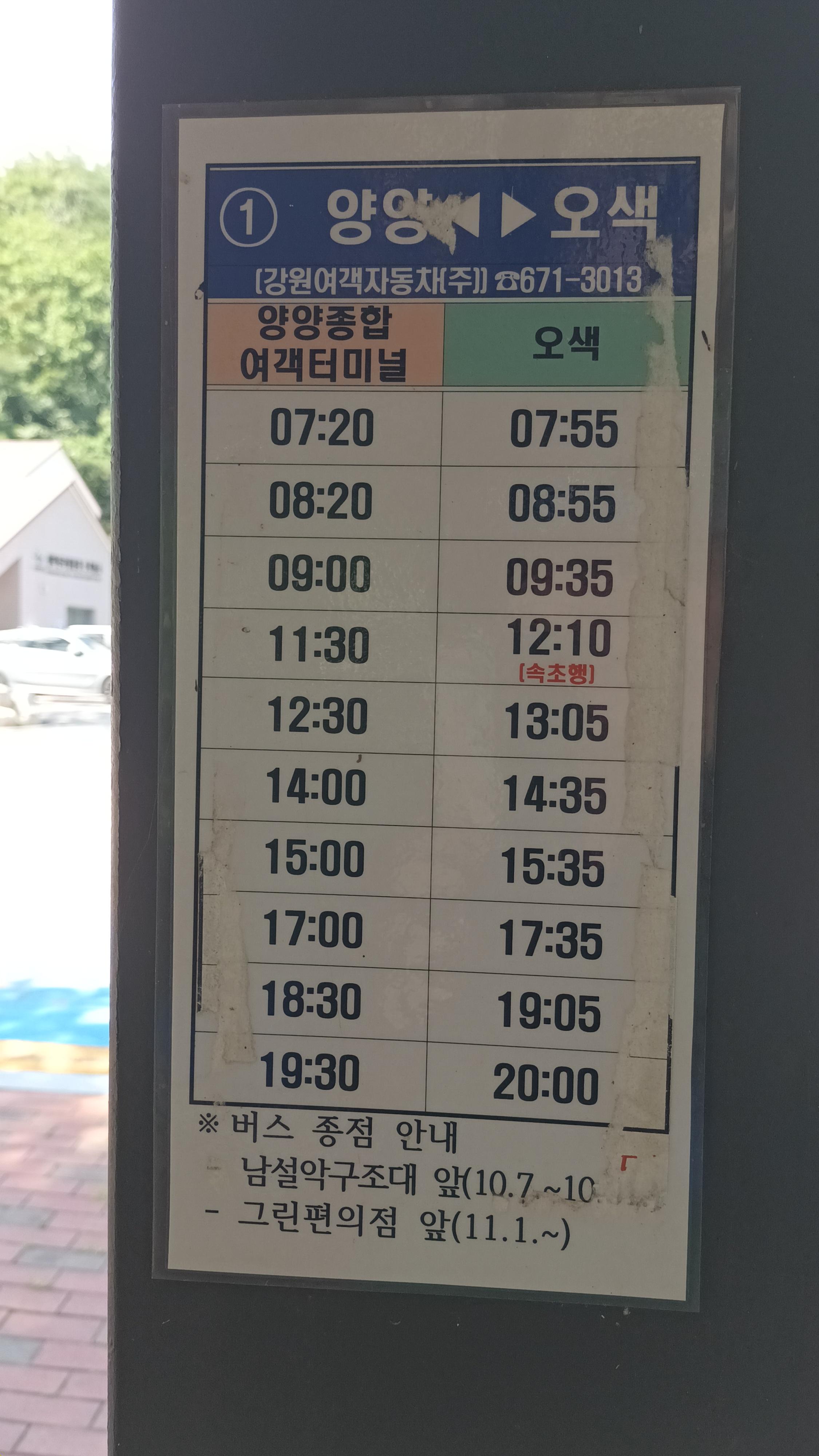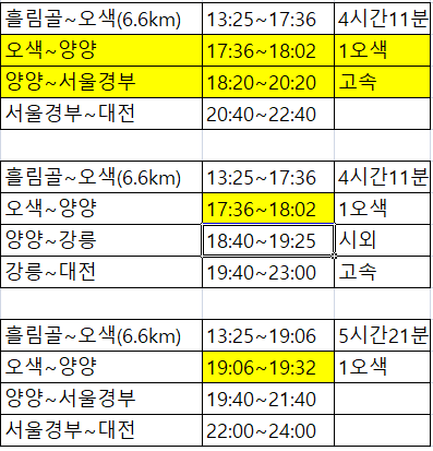 오색~양양17:36~18:02 1번버스승차 양양버스터미널~서울경부 18:20~20:40 서울경부~대전 21:00~23:00