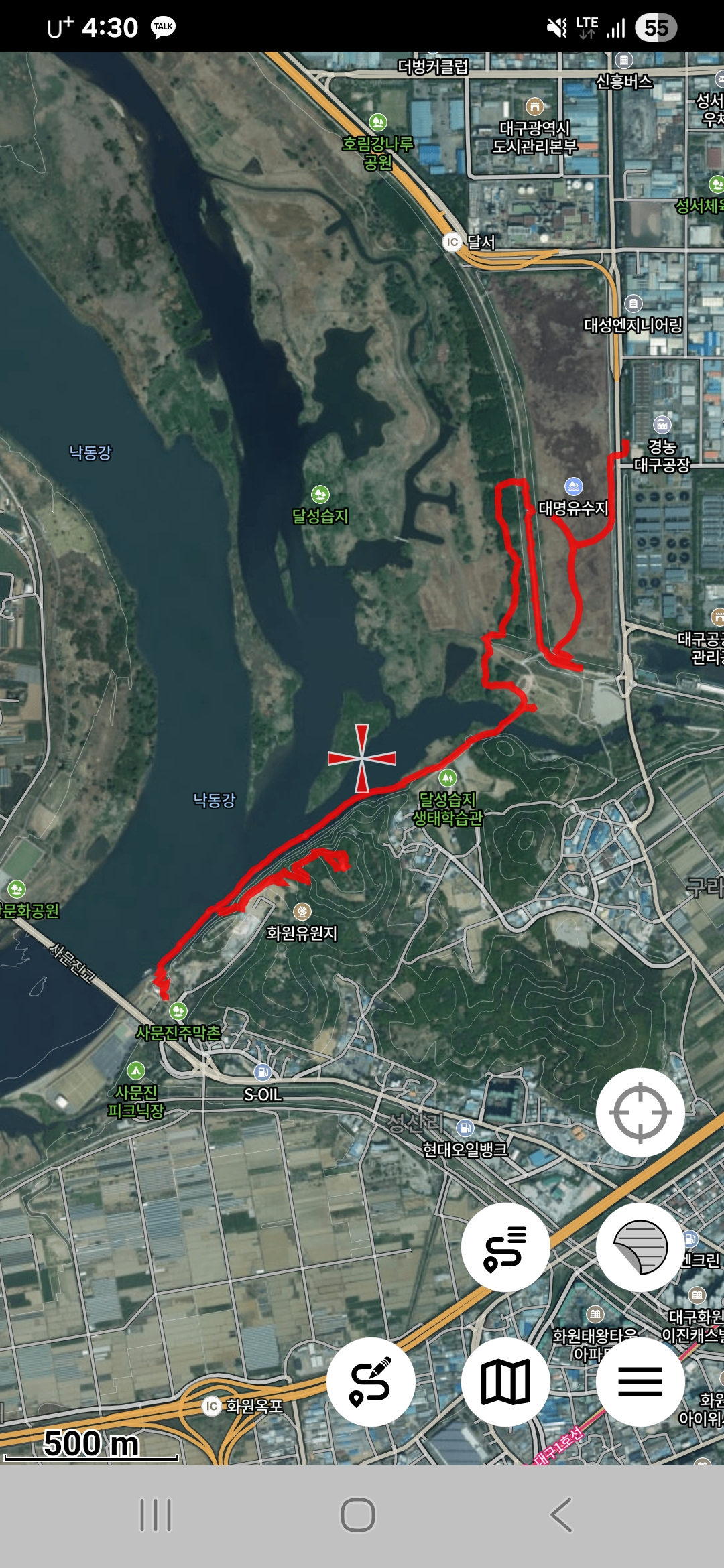 우측 상단 화원전망대 우중간 길이 낙동강생태탐방로에서 왔던길